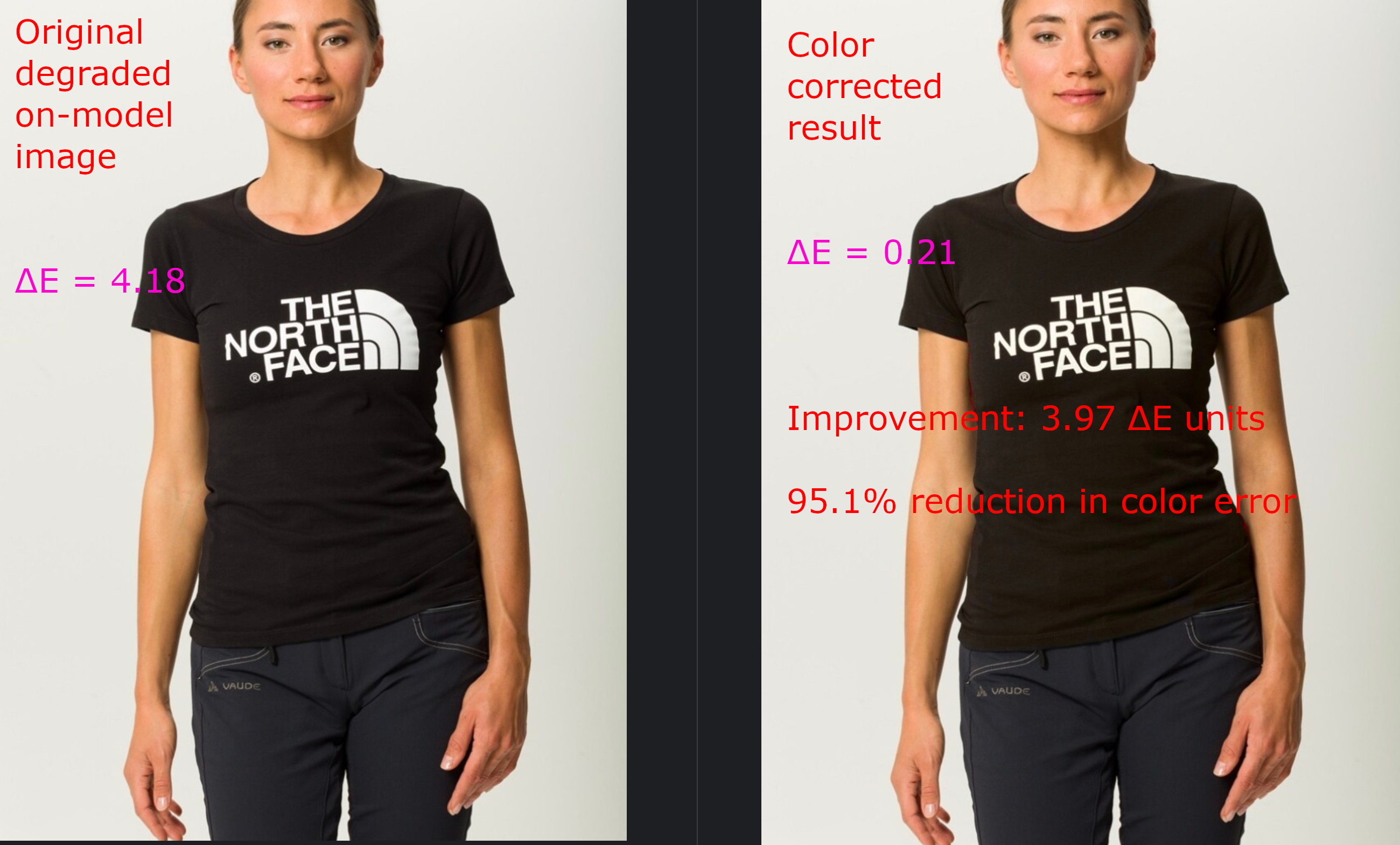 DeltaE is an automated color correction pipeline that ensures AI-generated on-model fashion images match the exact color of the original product photography (still-life). It’s named after ΔE (Delta E), the industry-standard metric for measuring perceptually-uniform color differences.
