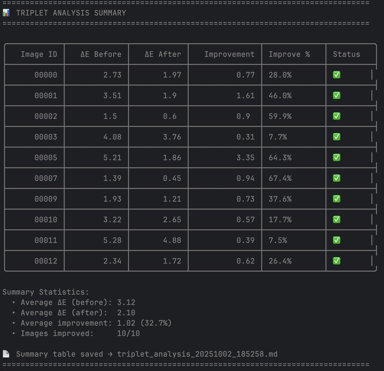 │ Image ID │ ΔE Before │ ΔE After │ Improvement │ Improve % │ Status │