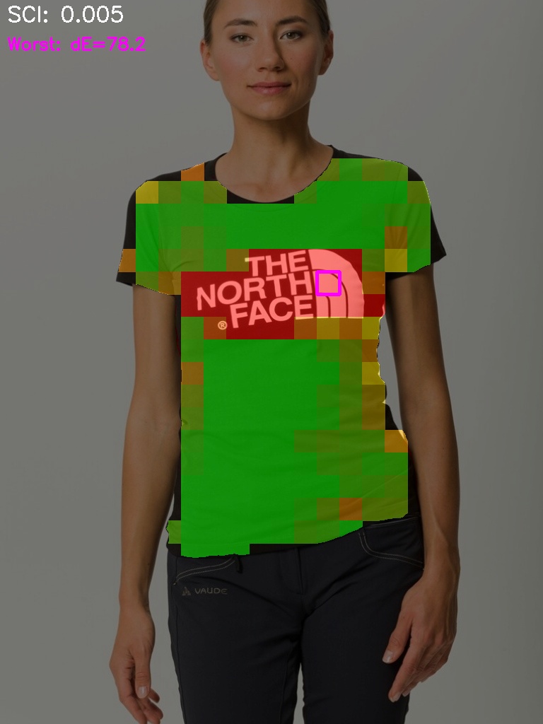 Spatial Coherence Index (SCI) - A novel contribution that divides the image into 32×32 pixel patches and computes per-patch ΔE. This reveals: