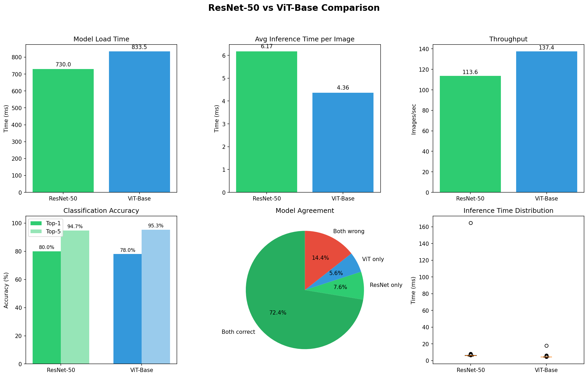 Complete benchmark results on 50,000 ImageNet validation images. ResNet-50 and ViT-Base achieve nearly identical accuracy (80.4% vs 80.3%) with ViT showing 26% faster inference and higher throughput.